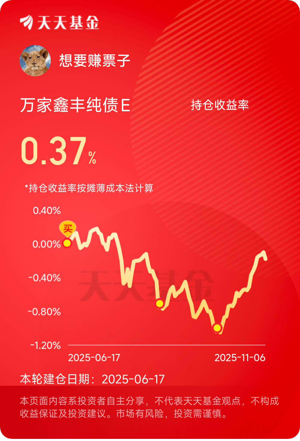 上次债市波动的时候就逢低加仓了,持仓的万家鑫丰纯债体验感还可以,有闲钱的可以自选