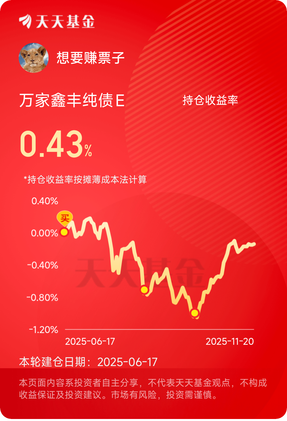 权益市场行情波动,还是多配置一些债基来做底部仓位配置吧,持仓的万家鑫丰纯债体验感还是很不错的!#晒收益#