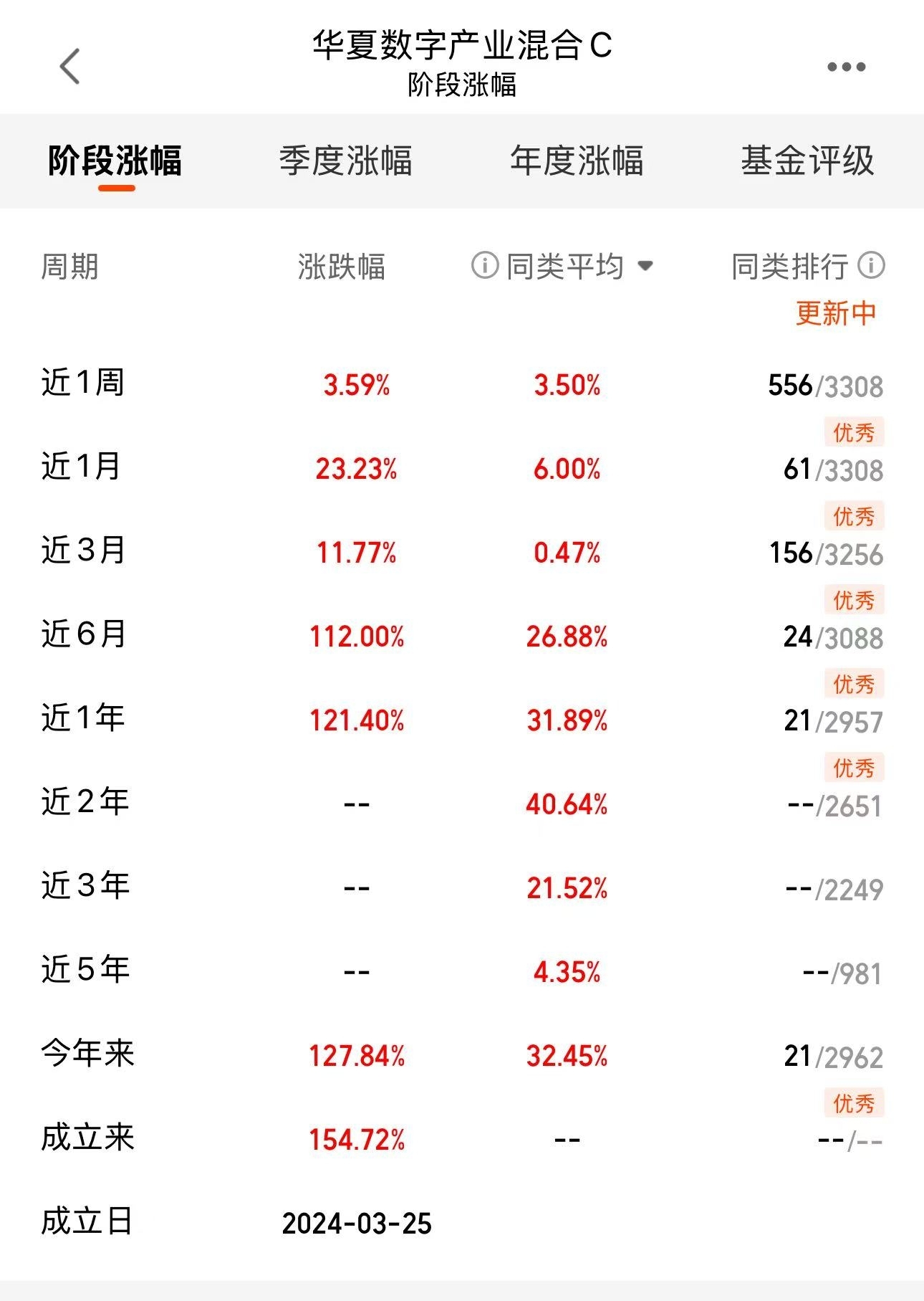 太牛了吧,今天继续上扬1.93%,所有阶段排名都很优秀,而且都是同类前列,近6个月和一年收益更是在同类基金中排到前1%,半年112%,1年121.4%,现在3天连涨就有7.25%的收益了,弹性很足啊$华夏数字产业混合C$