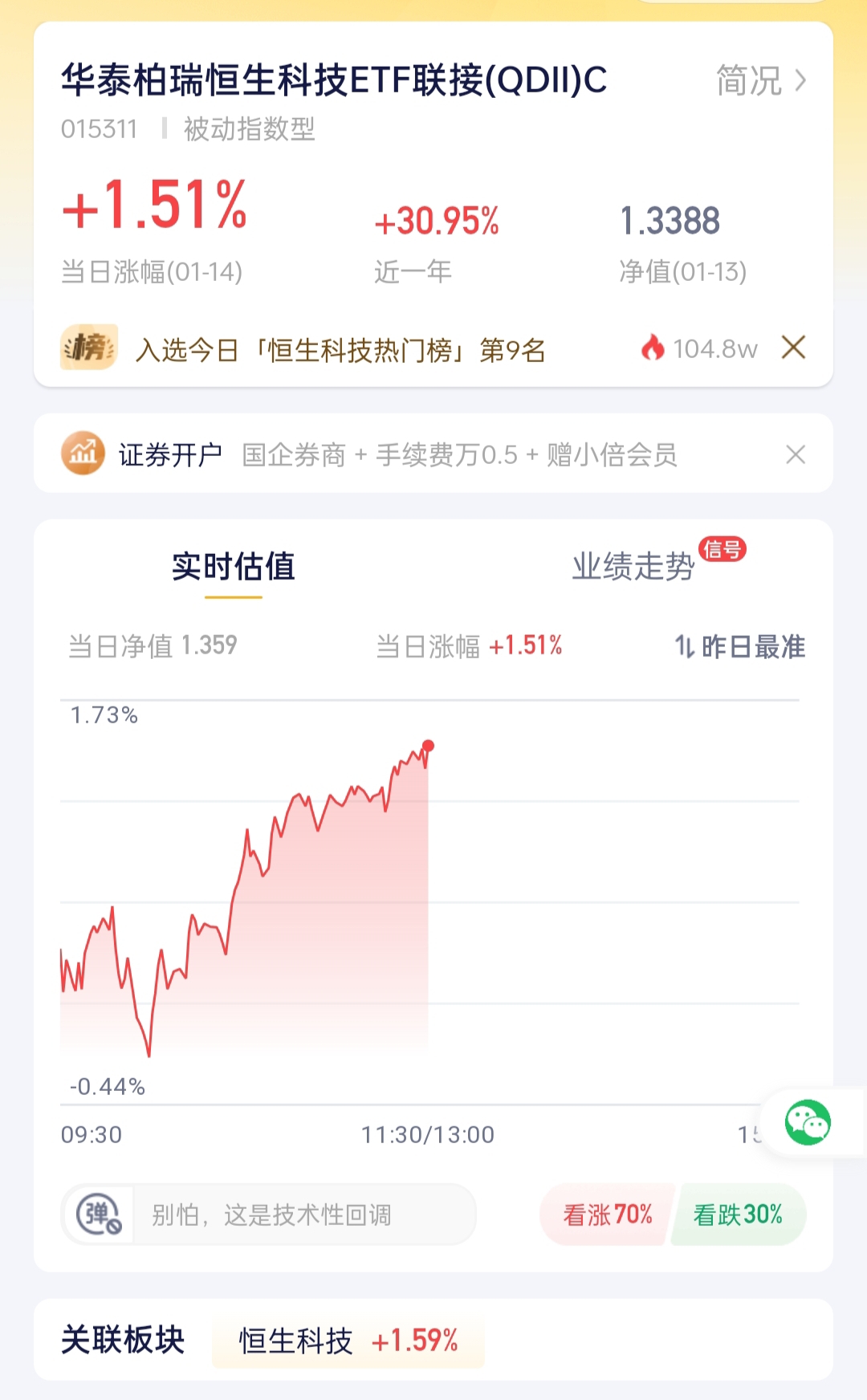 今天看恒生科技的行情,早盘先抑后扬,从跌0.44%到涨1.59%,走势特别亮眼。华泰柏瑞的相关产品也跟着涨了1.51%,近一年还涨了30.95%,不用开港股账户,小资金就能参与恒生科技的行情,比自己选股靠谱多了。$华泰柏瑞恒生科技ETF联接(QDII)C$ #暖阳创作计划#
