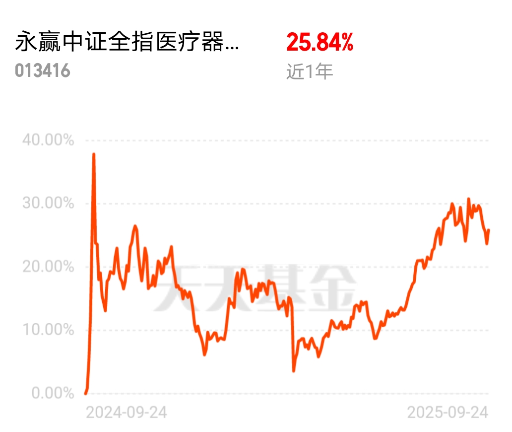 医疗器械:我今天新建仓$永赢中证全指医疗器械ETF发起联接C$ (013416)1000元。这支基金是中证全指医疗器械指数(H30217)的ETF联接基金。该指数由中证全指成分股中与医疗器械相关的个股组成。指数近1年涨27.28%,近6月涨11.08%,近3月涨14.98%,相比其它很多科技热门细分赛道,医疗器械目前尚处于低位,有非常迫切的补涨需求。