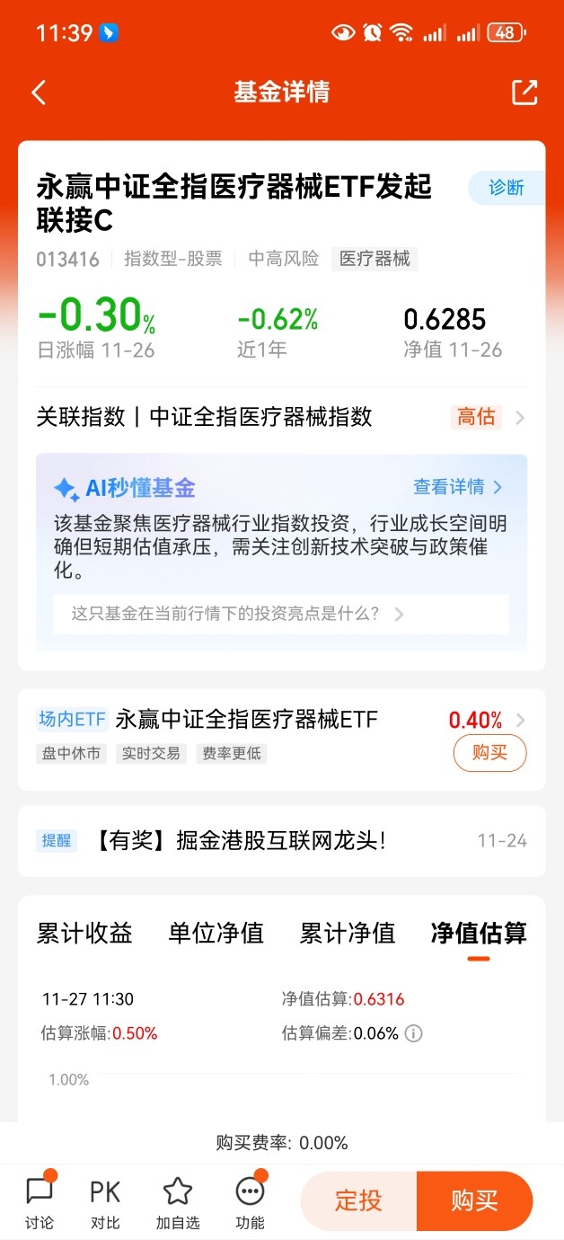 $永赢中证全指医疗器械ETF发起联接C$ 目前估值微红,有回暖的趋势了。该全市场首支规模最大的医疗器械基金,流动性也最好。目前医疗板块处在几年来的相对底部,性价比也是非常的高,正好可以开始捡取便宜筹码了。#低估补涨号启航#