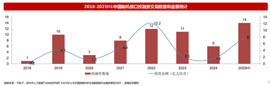 资本层面来看,自2020年以来,我国BCI行业的融资活动就进入到了活跃期。根据深圳市人工智能产业协会研究部的调查数据,2025H1我国脑机接口领域共发生14起融资事件,总融资规模预计超过8亿元人民币。