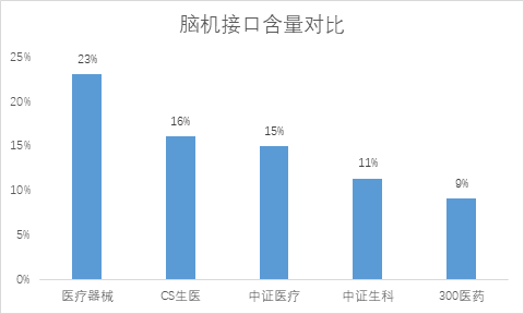 注:含量对比为全市场现有医药医疗类ETF跟踪的指数,其中脑机接口含量前5指数分别为h30217.CSI(脑机接口含量23%)、930726.CSI(16%)、399989.SZ(15%)、930743.CSI(11%)000913.SH(9%),脑机接口含量数据为万得脑机接口指数(886495.WI)所含成分股在各个指数中的权重占比。数据截至2026/1/5。