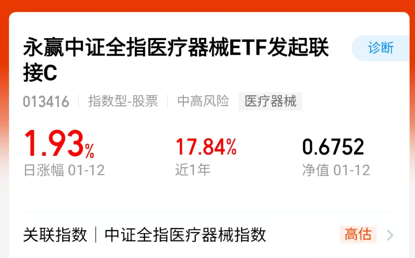各位粉丝朋友们,大家好!今天市场延续强势格局,医疗器械板块表现亮眼,$永赢中证全指医疗器械ETF发起联接C$(013416)今日涨幅超2%,近一周涨幅达5.2%,近一月涨幅9.34%,今年以来涨幅10.67%,表现相当抢眼!