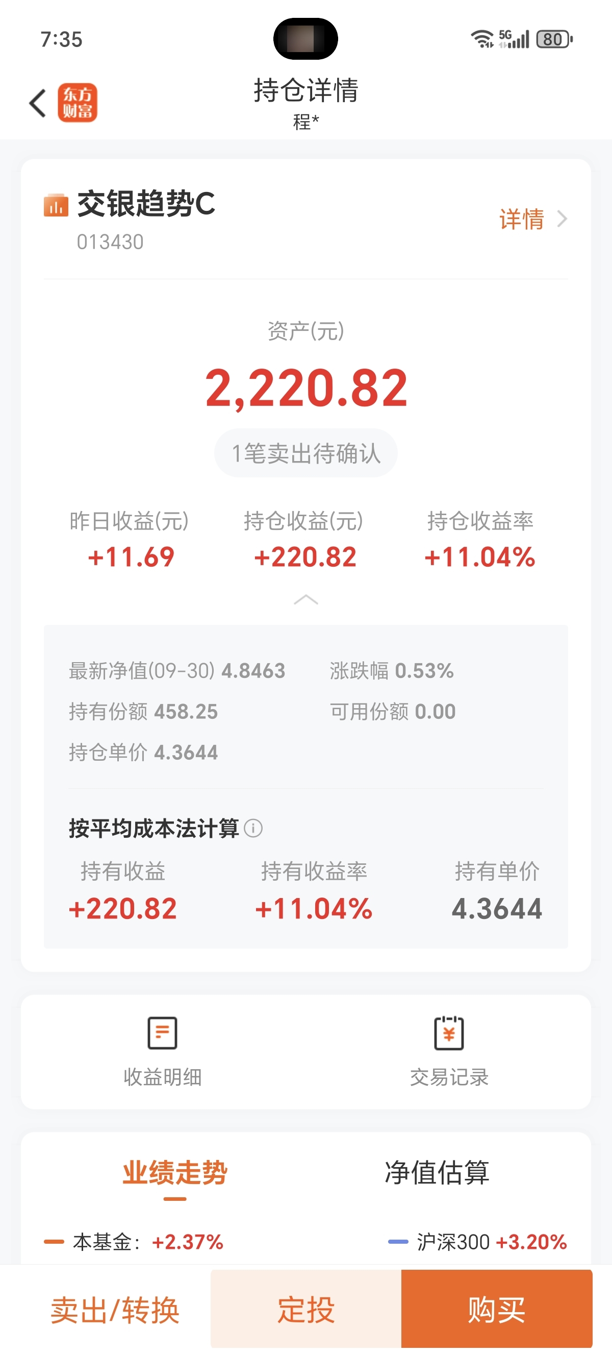 $交银趋势混合C(OTCFUND|013430)$ 2022年3月买入,至今3年半。今天全部卖出了,今天估计涨幅能有2%左右的吧。这样的话持有三年半大概13%收益,平均每年收益率估计是3%,比定期存款强那么一点点