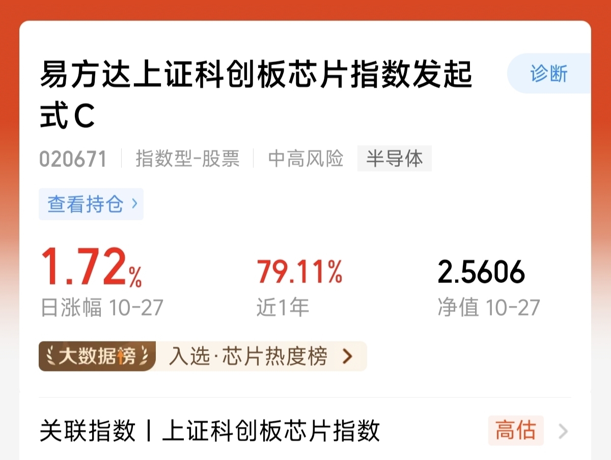 今天的芯片半导体又是尾盘惊喜,易方达上证科创板芯片指数。这只聚焦半导体芯片的指数基金。今天又涨了1.72%。再次超出了估值的预期,近一年涨幅79.11%。同类长期做到优秀。继续看好未来的收益表。