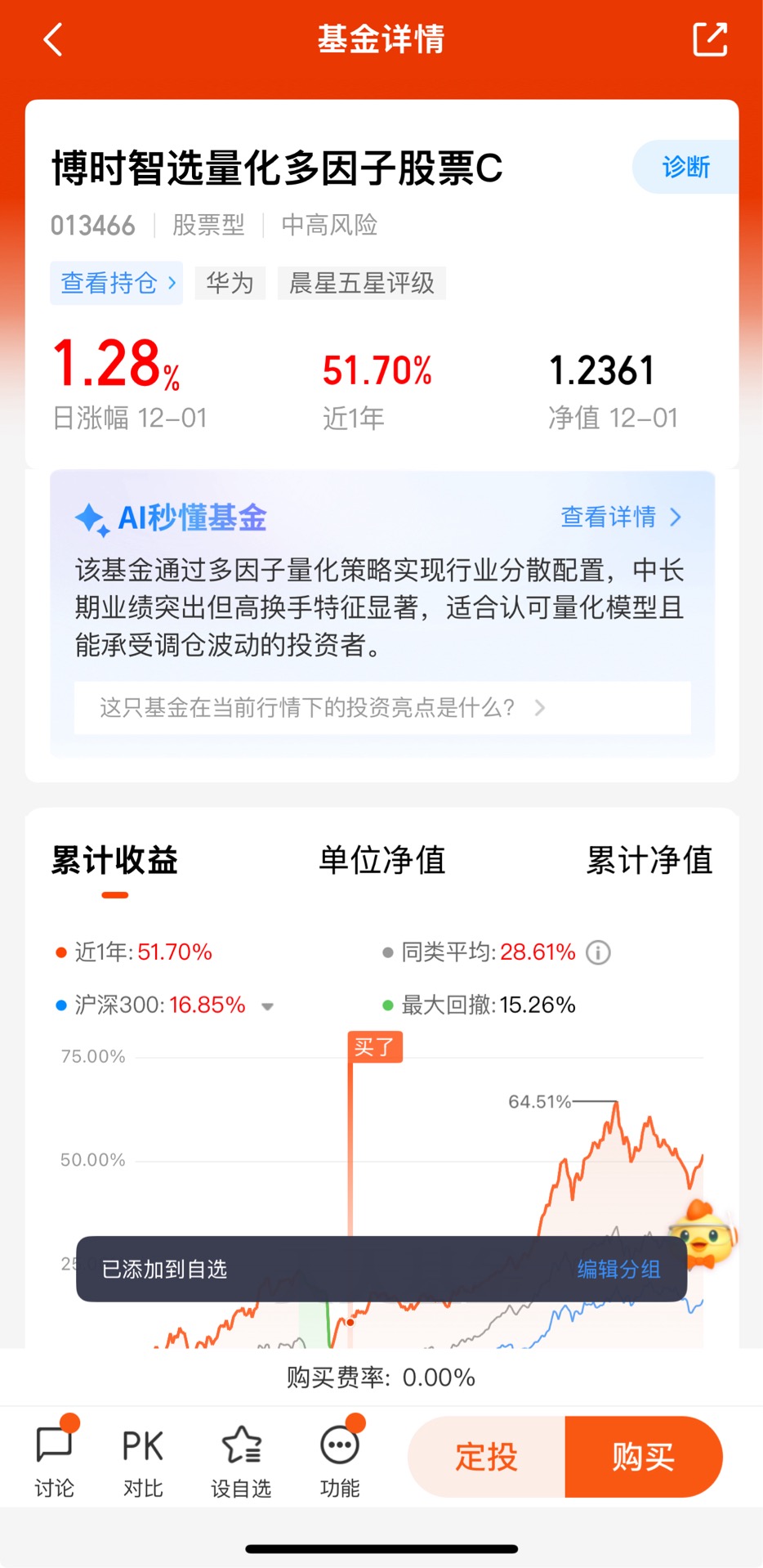 博时智选量化多因子股票C的投资目标是通过多因子量化模型方法,精选股票进行投资,在充分控制风险的前提下,力争获取超越比较基准的投资回报。如果你认同这种通过量化模型选股并追求超额收益的理念,那持有它就有了基本逻辑。比如你希望在控制风险时获取比市场平均更好的收益,这只基金就可能符合你的需求。