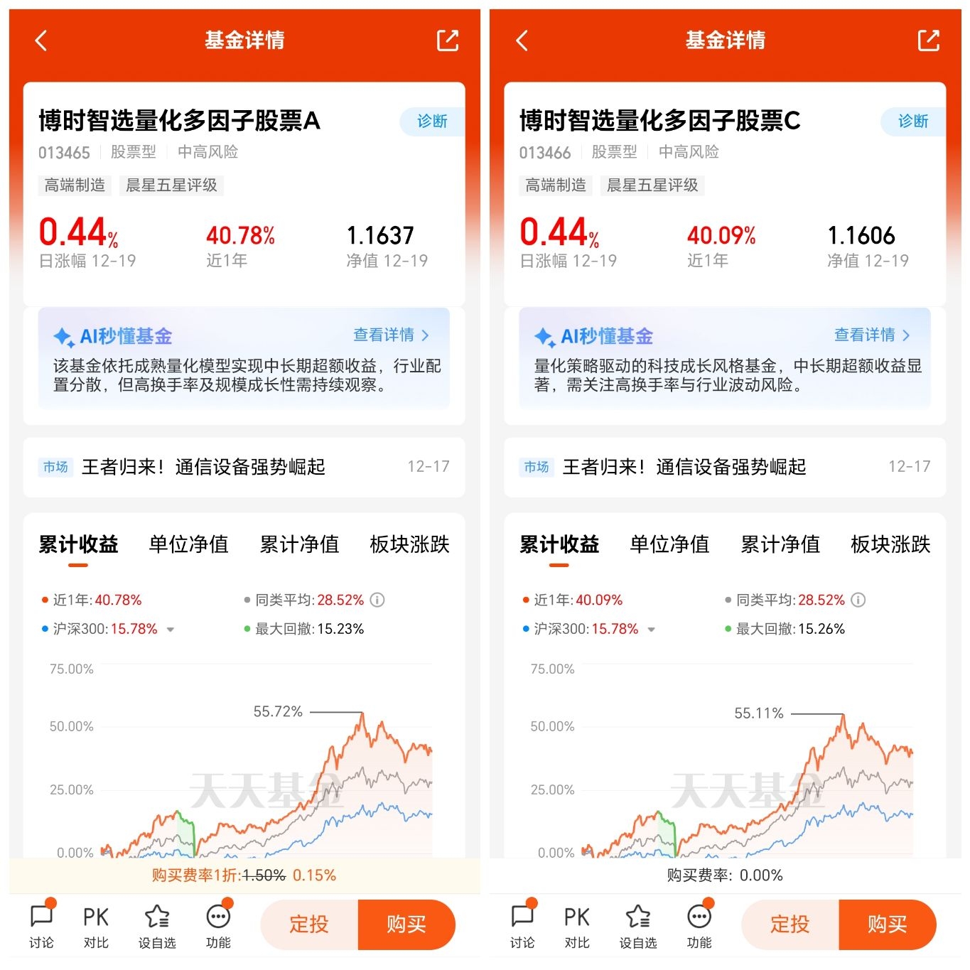 $博时智选量化多因子股票A$ 业绩优秀,今年以来涨幅40.59%,超额收益明显,全年回撤较小,性价比很高,超越80%的同类基金,带给持有人较好的持有体验,更有利于长期投资,该基金规模目前5.32亿,盘小绩优,船小好调头,有利于金牛基金经理刘钊捕捉市场当中的机会,给投资者带来满意的回报。