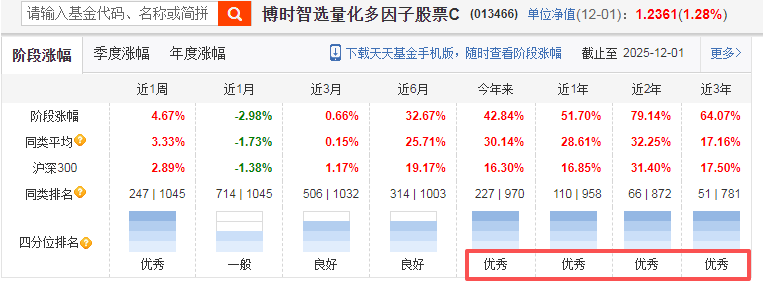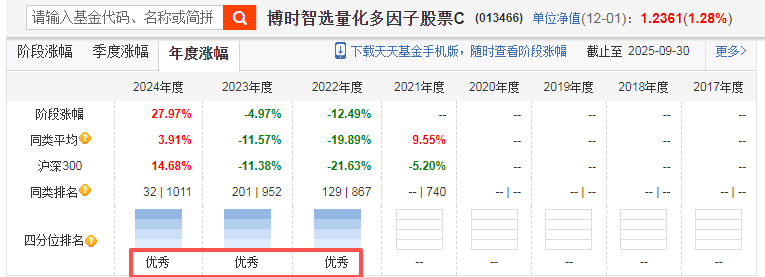 其次,表现相当稳定,博时智选量化多因子股票C(013466),不仅2025年的业绩领先,从2022至2024年,也是连续三年表现优秀的。