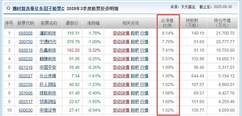 最后,量化策略持续进化。请见上图2023年1月的持仓数据,前10重仓股合计占比不到20%,第一重占比才1.81%。而2025年3季度的持仓数据,已经发生了巨大的变化,请见下图: