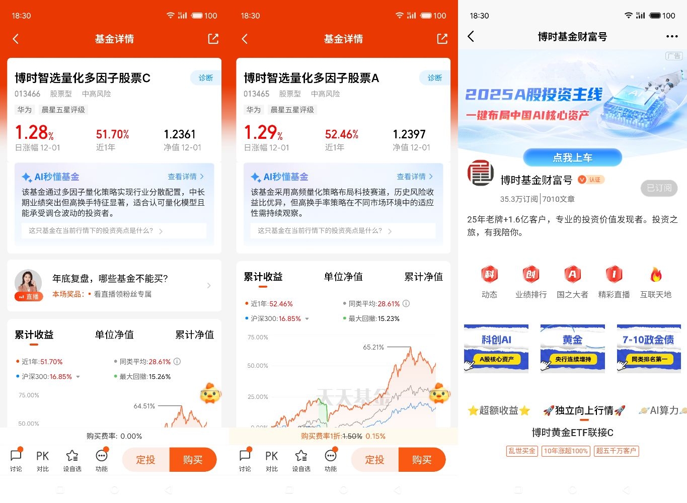 选择这只基金,源于我对传统投资方式的反思。过去我总试图通过研究个股、预判行业趋势获利,却屡屡因人性的贪婪与恐惧做出错误决策。而博时智选量化多因子股票C的核心魅力,就在于用量化模型规避了主观择时的弊端。基金经理刘钊拥有近20年量化投研经验,其团队搭建的因子库涵盖成长、估值、盈利质量等超百个维度,通过机器学习持续优化选股逻辑 。截至2025年12月,基金近12个月涨幅达51.36%,近三年在业绩比较基准下跌6.77%的情况下实现23.90%的净值增长,超额收益能力一目了然 。这种“用数据说话”的策略,让我不用再纠结于每日市场波动,只需坚定执行定投计划。