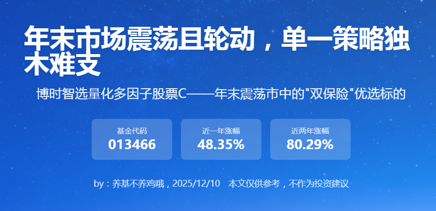 虽然平时以工作为主,但我从未忘记投资理财。到了年底除了盼年终奖之外,最关心的就是基金账户能不能“完美收官”。今年A股震荡幅度堪比plus版本的云霄飞车,板块轮动快到让人眼花缭乱,想在这样的市场里赚点超额收益,选对基金比啥都重要。经过一番精挑细选,前两天我果断锁定了博时智选量化多因子股票C(013466),并决定分批布局。下面就从市场环境、基金业绩、策略优势等方面,跟大家聊聊为啥它值得入手。(自选图在文末哦)