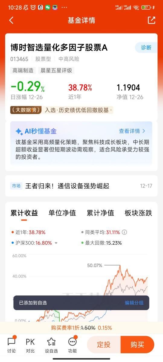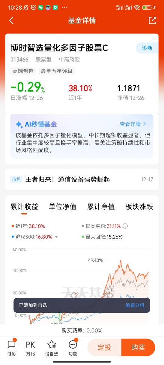 说实话,以前我也是个爱跟风的基民,听说哪个板块火就冲进去,追涨杀跌忙活大半年,结果收益还不如存银行。后来踩的坑多了才明白,普通人想赚超额收益,靠自己盯盘选股根本不现实,不如把钱交给靠谱的量化基金。这只博时智选量化多因子股票C,就是我对比了十几只基金后挑出来的“省心款”。