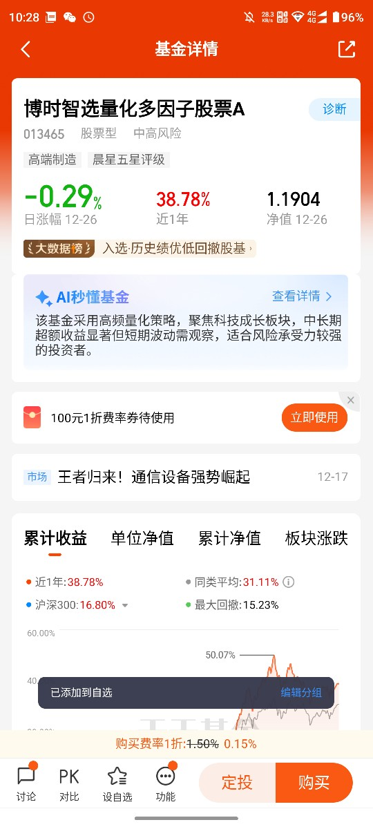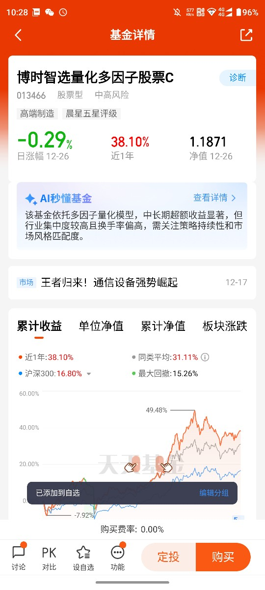 就拿今年来说吧,上半年AI和半导体炒得火热,我身边好多人追着买相关基金,结果涨得快跌得也猛。而我持有的这只博时量化基金,模型早就根据因子信号,悄悄配了一些低位的科技股,没等心,就跟上了行情。后来板块回调,因为它持仓分散,回撤幅度比那些单押赛道的基金小多了,这就是量化策略的稳健性。