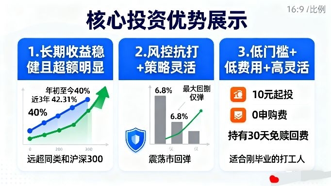 3. 低门槛+低费用+高灵活:10元起投,0申购费,持有30天免赎回费,每月定投几百块无压力,适合刚毕业的打工人。