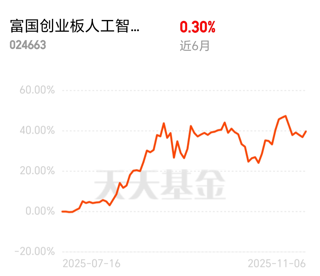 同时持有着金融科技和富国创业板人工智能ETF联接C,后者近3个月涨了31%、半年37%,跑赢大多数同类;这季度成分股净利润猛增58%,估值还比过去五年35%的时间便宜,拿着挺安心。$富国创业板人工智能ETF发起式联接C$