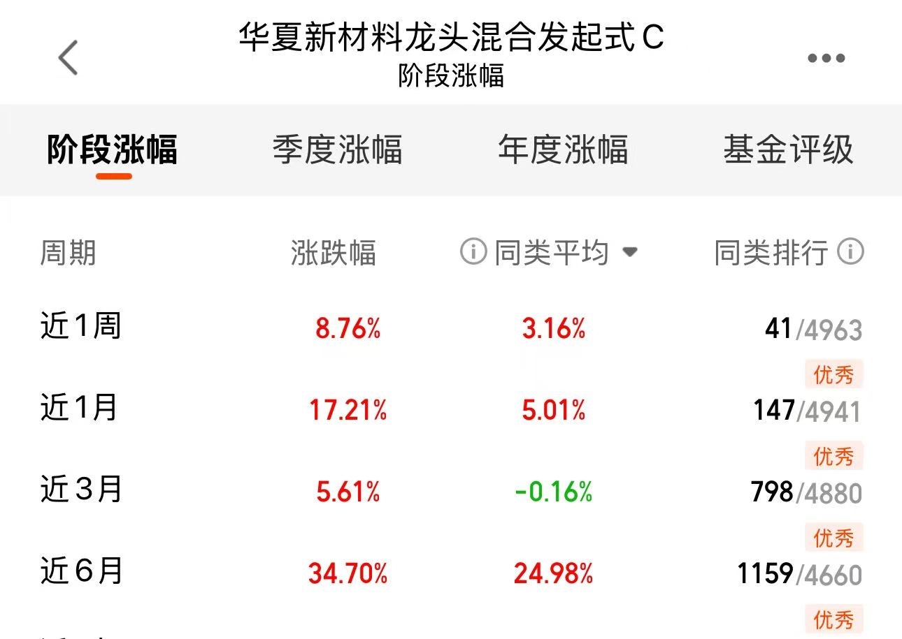 这基本周连红3天,3天增收超11%,近一周收益近9%,排名前1%(41/4963)今天趁低继续加仓$华夏新材料龙头混合发起式C$这里布局的都是AI新材料,成长空间好