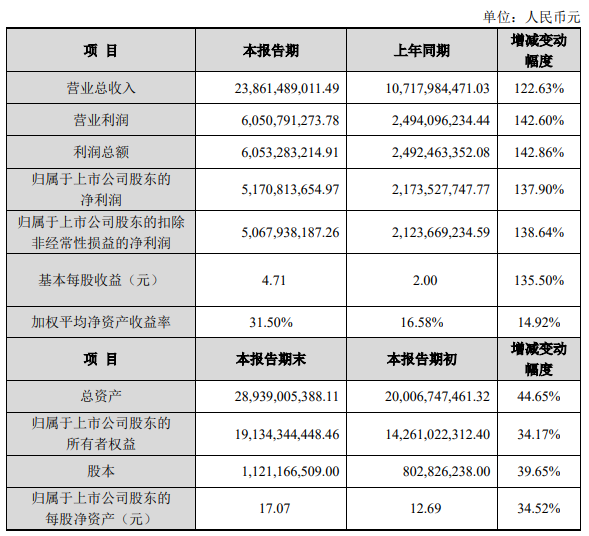 业绩快报显示,2024年中际旭创实现营业总收入238.61亿元,同比增长122.63%;归属于上市公司股东的净利润51.71亿元,同比增长137.90%;归属于上市公司股东的扣除非经常性损益的净利润50.68亿元,同比增长138.64%;基本每股收益4.71元,同比增长135.50%。