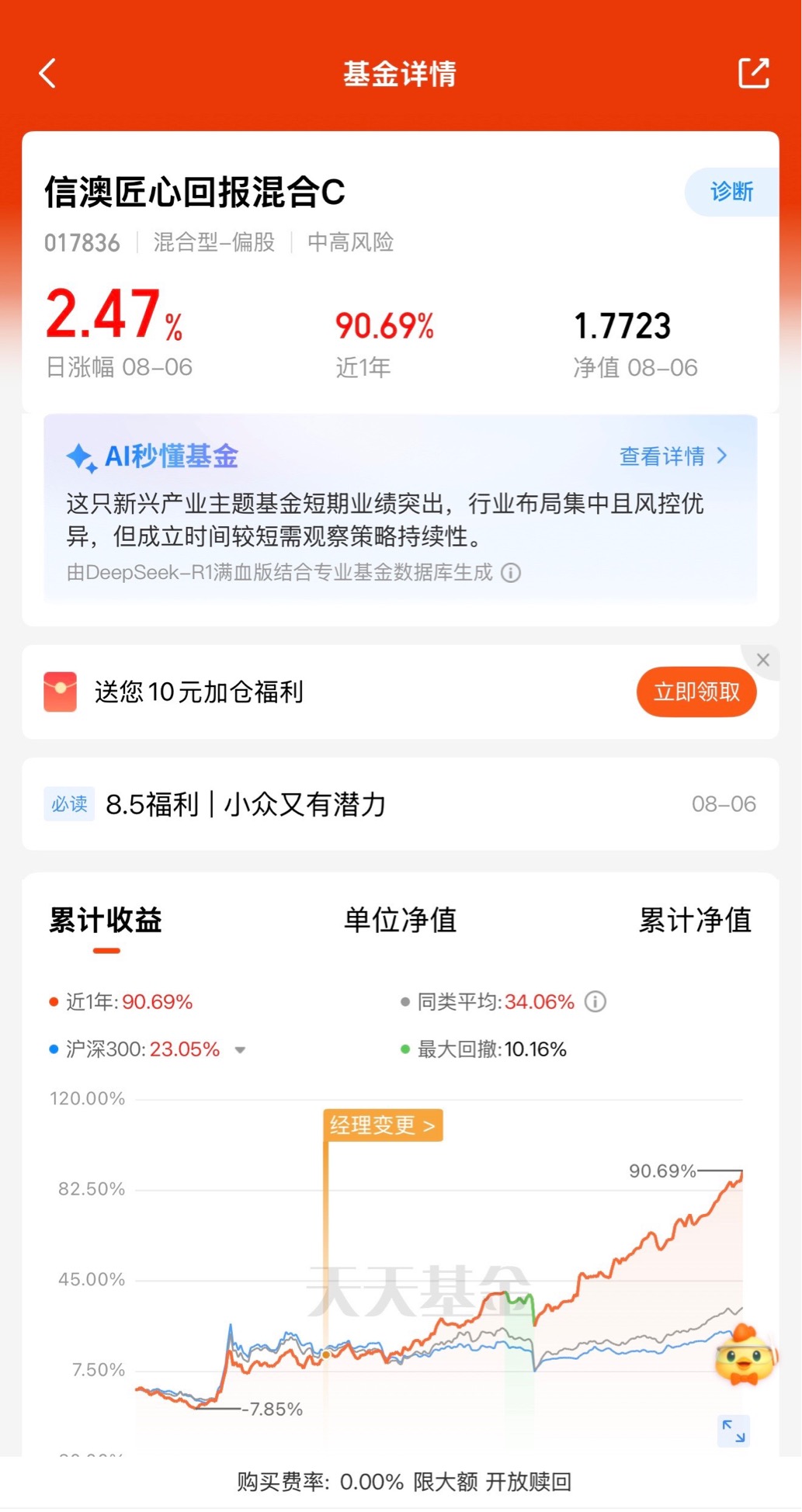 价值投资的果实总会成熟,像我关注的信澳匠心回报昨晚就收获了2.47%,近一年收获