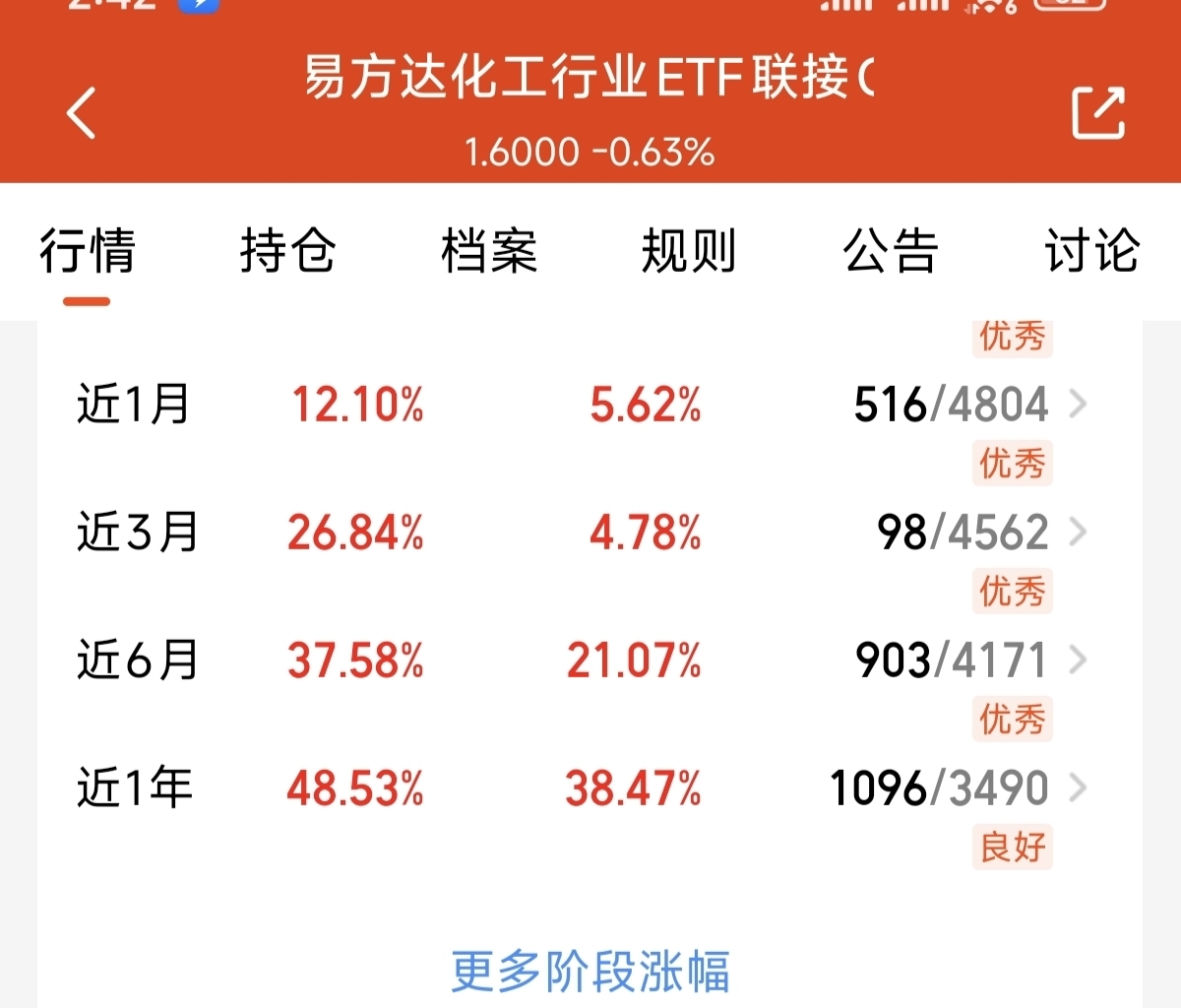 今天的市场出现了集体调整。由于黄金的调整,再度创出新低。带动了大宗商品的继续下跌。今天的化工板块也是出现了调整。但是从产业基本面可以看到。化工板块目前随着原油价格的上涨,化工产品的涨价预期依然还在,而且随着下游春季备货加速,以及新能源等快速的发展。化工产业长期的成长空间目前依然还在。一方达化工产业这支聚焦化工主题的指数基金。全面覆盖了化工的产业链。近一年上涨了48.53%。在同类化工基金中,业绩长期做到了优秀。今天的回调也是前期上涨过后的回踩,我看好随着后续金价企稳,化工产业的成长表现。