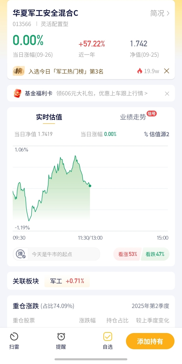 9. 华夏军工安全混合C:昨天跌0.06%,今天估算0.00%,不涨不跌持平了,也算稳住了,看看后续能不能往上冲一冲。