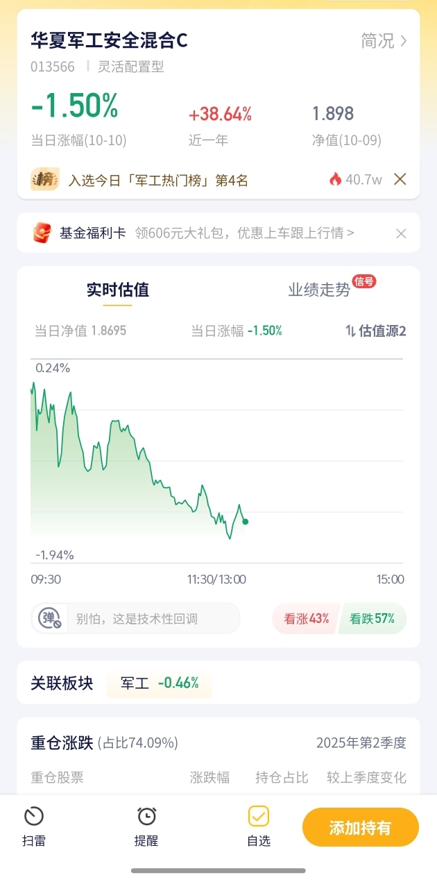 9. 华夏军工安全混合C:9号涨2.48%,10号估算跌1.42%,昨天猛涨今天猛跌,军工这性格太火爆,咱投资它就得有定力扛得住。