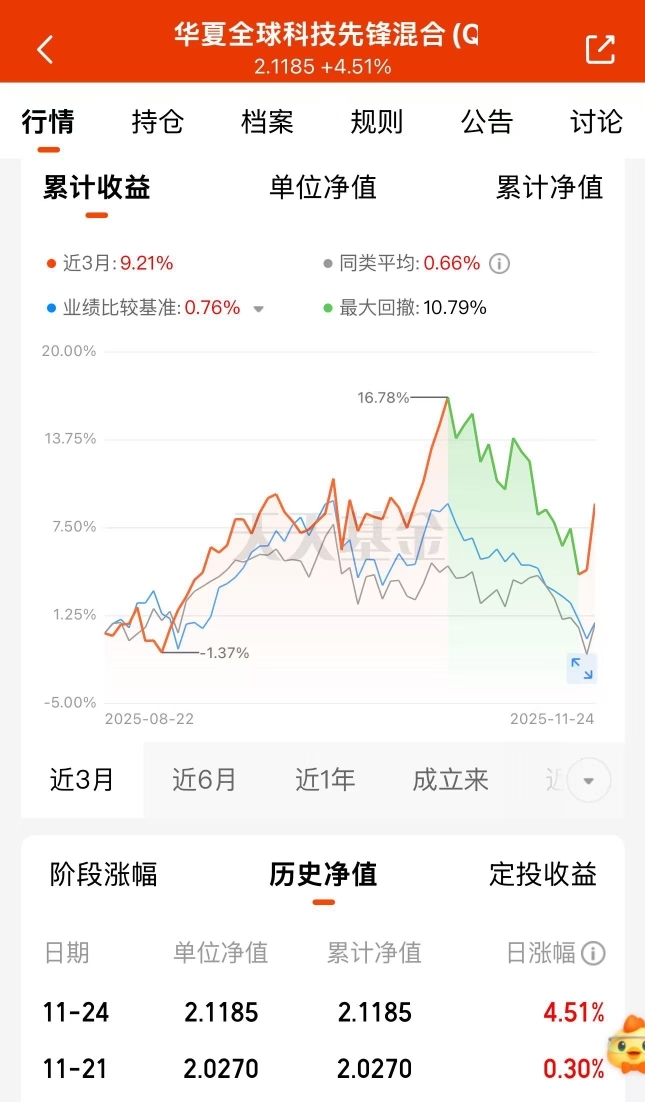 外围市场回暖,还是更看好科技方向,这基近一周收益同类第五,昨天趁势吃上了4个点的大肉,超额收益不错,$华夏全球科技先锋混合(QDII)C$现在限额5万,趁还有额度,收益也才开始,可以布局中长期了