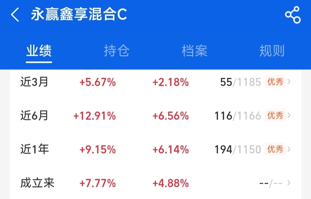 好消息!我今天发现永赢鑫享开放了,以前只能进一千,今天居然不限购了!这无疑是今天最好的好消息。我来抄底了,今天再补永赢鑫享两千五,凑够一万。这是2024年比华子方正还牛的债哦,之前一直限购,我每天自动定投一千,现在终于可以甩开膀子干了。我从去年下半年开始买,赚了不少了,这波打开限购正好在债市回调之后,估计后面债市有机会了。持有感觉真的很舒适,极端行情下丢蛋比华子方正要少,收蛋时却比它们要多,典型的涨多跌少,这样才能累积蛋嘛。别看它名字是混合,其实是纯利率债策略,进攻性好,爆发力强,业绩表现一直要圈可点,近三个月收了567个蛋了,近半年收了1291个蛋,是同类均值的两倍了,好多纯债两年都未必有这个成绩呢,它用半年时间完成了很多债基两年收益。各阶段涨幅远超大部分同类基金,同类排名全是“优秀”,这些都是它用实打实的成绩铸造的功勋标志。回撤也不大,回调后修复快,我拿它来替代方正和兴华了。