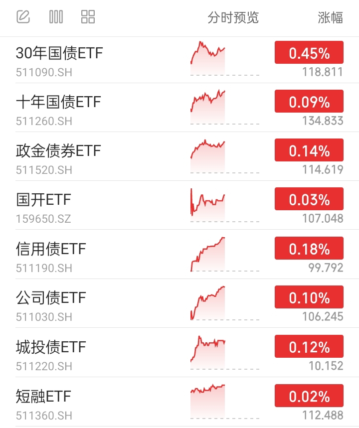 信用债ETF、公司债ETF、城投债ETF,代表信用债基。全部上涨