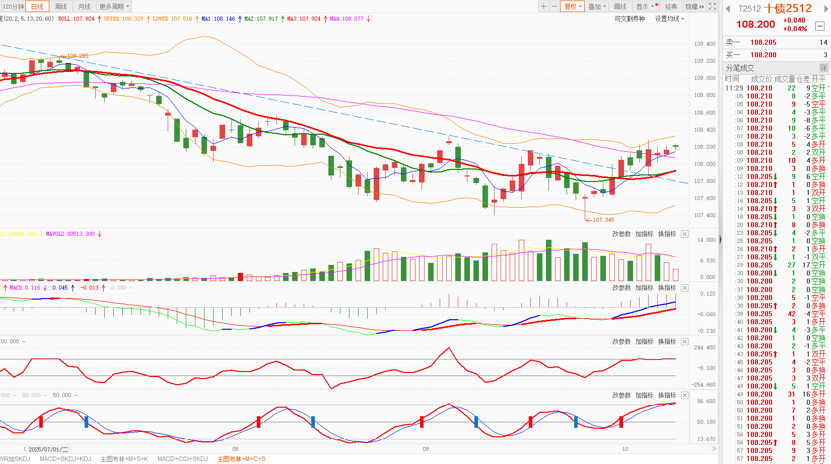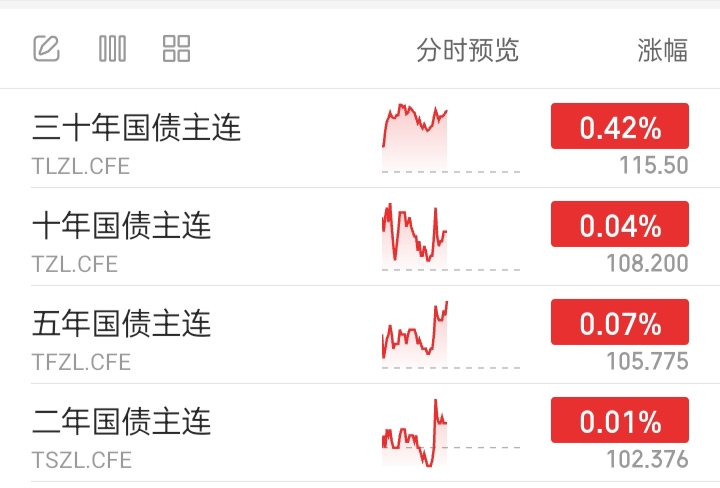 今天国债期货日K线收盘后全部在5日均线之上,整体走势较强。