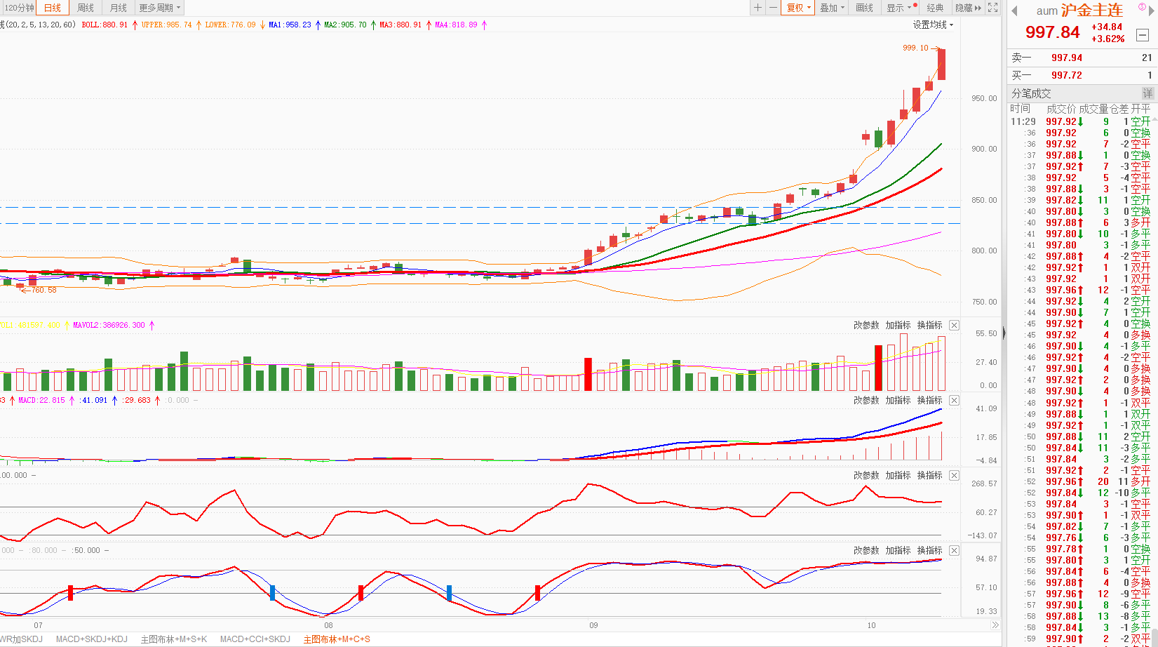 沪金主连:涨3.62%,日K线在5日均线之上。今天沪金继续大涨,日K线在布林线上轨之上,马上就要突破1000元的大关了。目前美元降息预期以及贸易冲突等消息持续利好黄金,黄金ETF等投机资金大量涌入,推高金价,没有更高,只要最高,目前上升动能仍然很强劲,后市可能继续上行。
