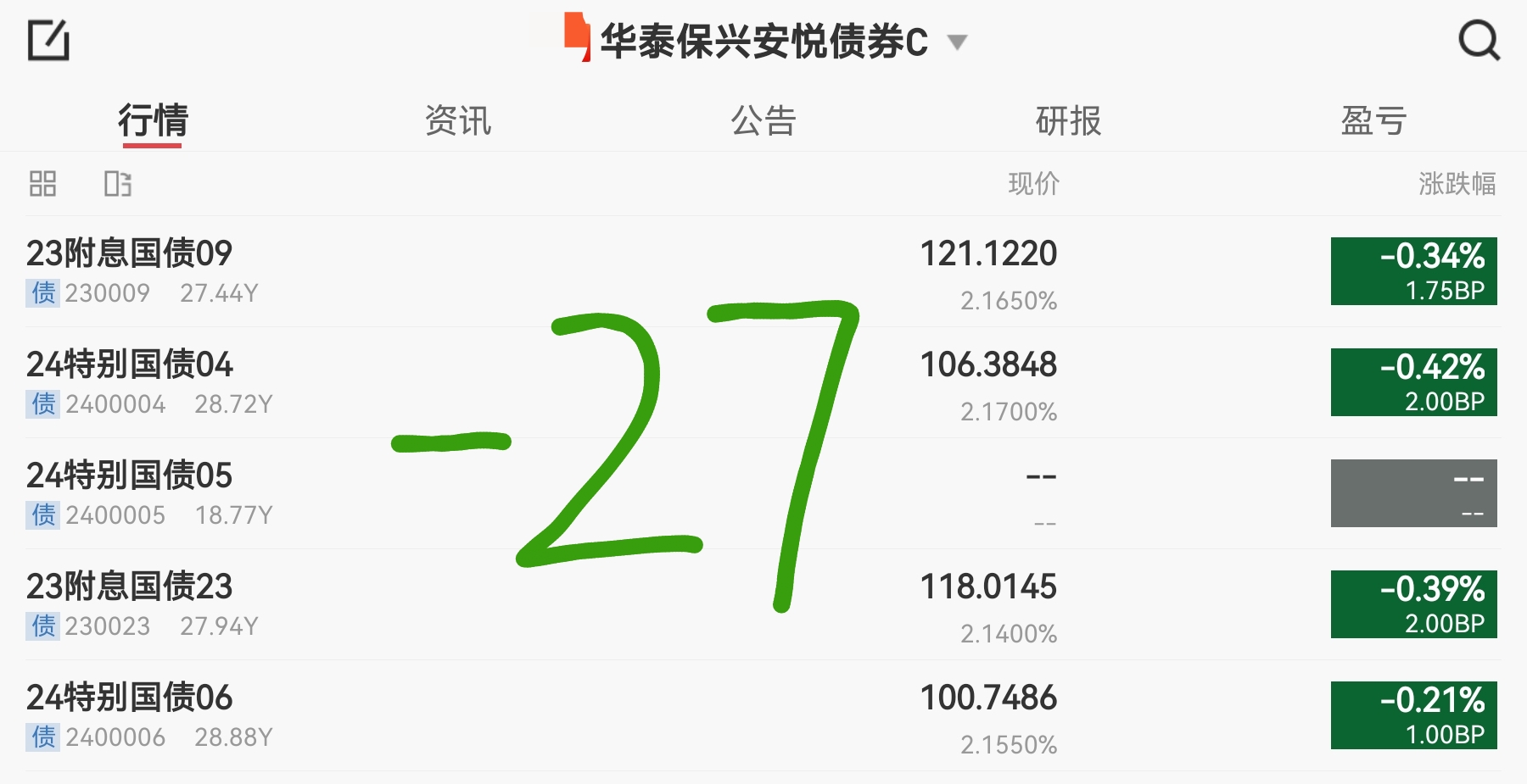 下午盘中利率债出现了较大幅度的下行,华泰保兴安悦债券C的跌幅也是明显扩大,目前丢27个蛋5。