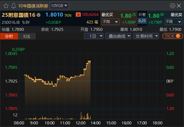权益市场持续冲高,这也致使利率债在盘中出现了比较明显的下行,从下图来看下,250016的收益率上行速度还是比较快的。