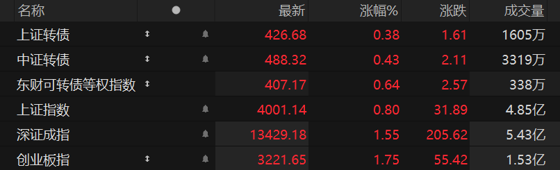 今天权益市场放量上涨,盘中的走势也是非常的强势,在它的带动下,可转债也有较好表现。不过今天债券市场表现相对疲软,国债期货和利率债出现了非常明显的回调;信用债也出现了明显的信用等级分化;同业存单目前表现还不错,目前处于小幅上涨状态。
