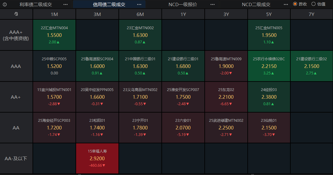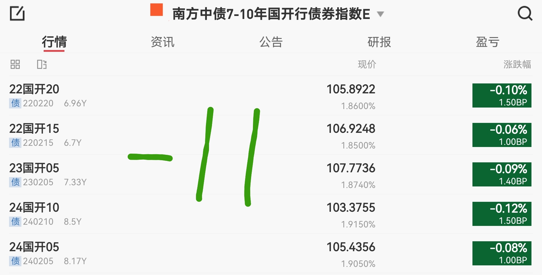 目前国债和政策性金融债基本上都已经绿了,并且5~30年期的债券跌幅相对较大。