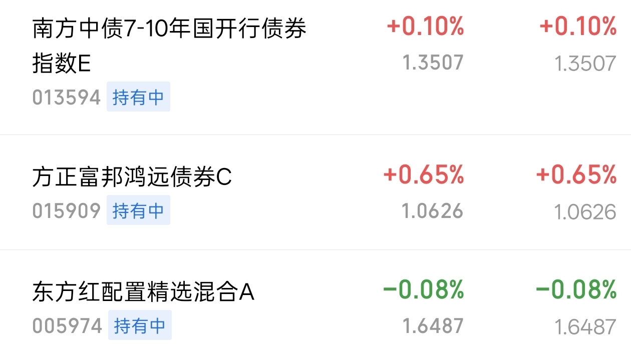 债市今天悄悄发力,利率债涨幅不大但收益扎实。7-10年收了约9个,$方正富邦鸿远债券C$ 收了65个蛋,另一只短久期产品也贡献了3个,虽然不是大涨,但细水长流更安心。