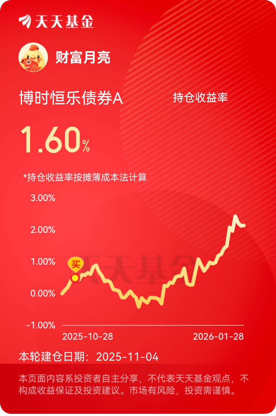 A股在4100点上方博弈加剧,债市却显得气定神闲,固收+的优势就显出来了。$博时恒乐债券A$ 主要靠债券资产求稳,再用一部分权益仓位上探收益,近一个月1.3%+,一年下来收益累计超9%,表现持续在线。近期国务院常务会议部署建立了民企债券风险分担机制,中央财政出台政策为优质民企发债提供增信支持。这个政策直接改善了民企的融资环境,降低了信用债的违约风险,对于博时恒乐这只持仓大量高等级信用债的基金来说,无疑是重大利好。之前还担心信用债有违约风险,现在有了政策支持,信用债市场越来越稳健,这只基的债券部分收益也更有保障了,而且优质信用债的收益率也在稳步提升,简直双丰收的节奏!其权益仓的配置也相当聪明,新增的中国太保、华泰证券这两只蓝筹股,简直是神来之笔。1月份机构策略里明确提到要增配非银板块,券商、保险板块迎来估值修复行情,中国太保作为保险龙头,估值一直处于低位,后续修复空间很大。华泰证券作为券商龙头,受益于市场交投活跃,业绩有望持续提升。现在债市有政策托底加上市场流动性充裕,权益仓还能蹭上市场热点,咱抱紧了跟着稳稳收蛋就行!#2026年 你最看好哪些投资赛道?# #晒收益#