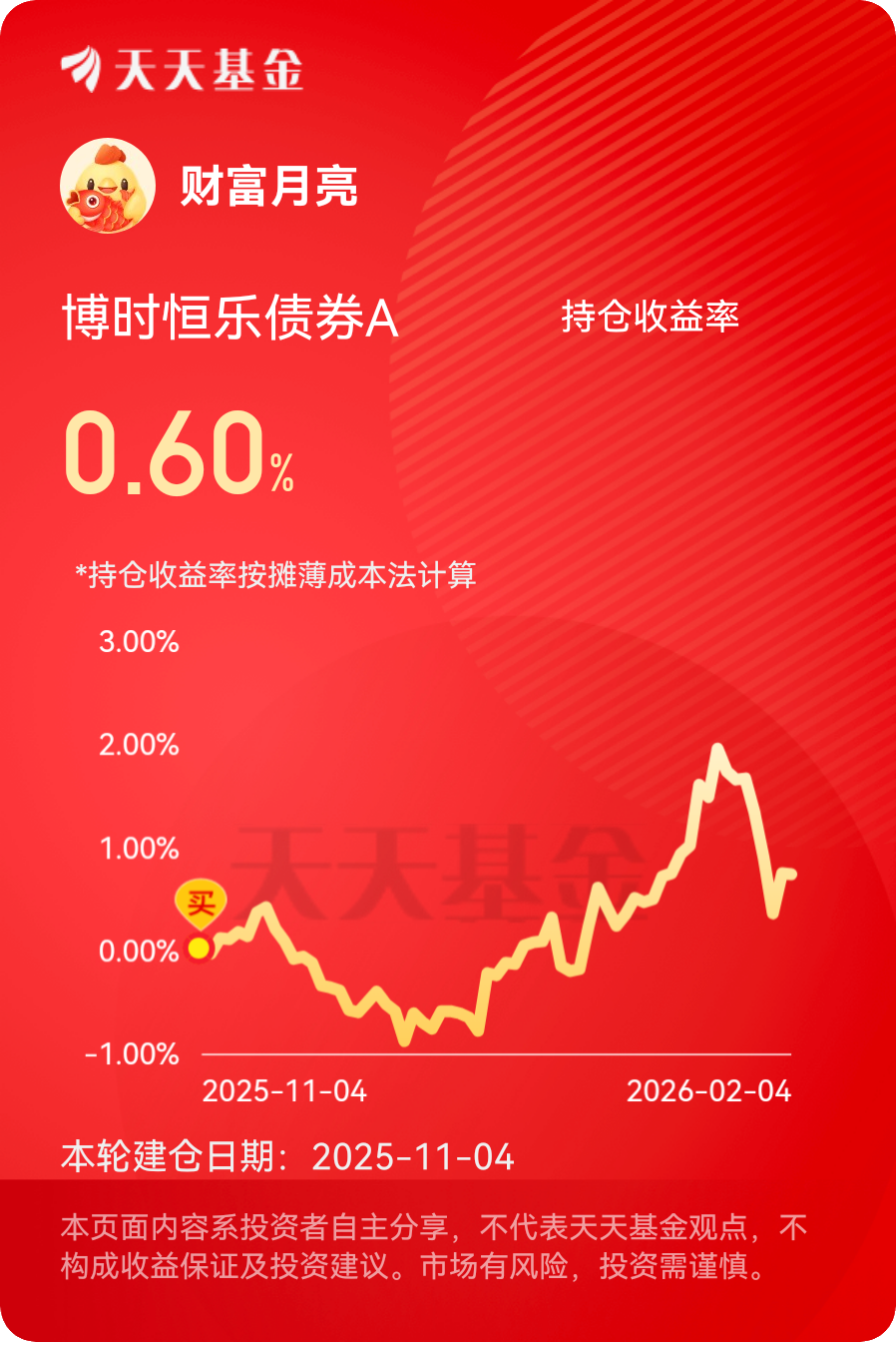 经历过市场波动,更懂得稳健的价值。$博时恒乐债券A$ 是我组合里的稳定器,债券筑底,股票增强,一个月默默囤蛋92个,近一年带来了超过8%的回报,这种慢积累反而让人更安心。1月29日国务院发文,明确支持文旅、体育、家政等服务消费领域发债,这不仅拓宽了信用债的发行渠道,还能让信用债市场更具活力。博时恒乐有不少消费相关的信用债持仓,这次政策支持下,这些债券的估值有望进一步修复,信用风险也大幅降低。而且这基的信用筛选能力超牛,用的是博时内部的信用评分系统,能精准避开雷区,保证债券持仓的高质量。更让人惊喜的是它的权益仓位,简直意外之喜,持仓里除了金融股,还有万华化学、铜陵有色这些化工、有色板块的龙头股。最近化工板块迎来了景气周期,国海化工景气指数持续上升,炭黑、己二酸等产品价格上涨,整个板块的估值都在修复。万华化学作为国内化工龙头,简直是化工板块的扛把子,以技术创新驱动发展,有高技术和低成本两大护城河,现在正朝着全球化工龙头迈进,成长性远超周期性。再加上铜陵有色,作为有色板块的龙头,受益于新能源汽车、光伏等行业的发展,铜价稳步上涨。这基精准布局了化工、有色这些高景气板块,而且权益仓位占比不高,只有20%左右,既能享受板块上涨的红利,又不会增加太多风险,这配置完美稳赚!#马斯克密访中国光伏链?上市公司密集回应# #晒收益#