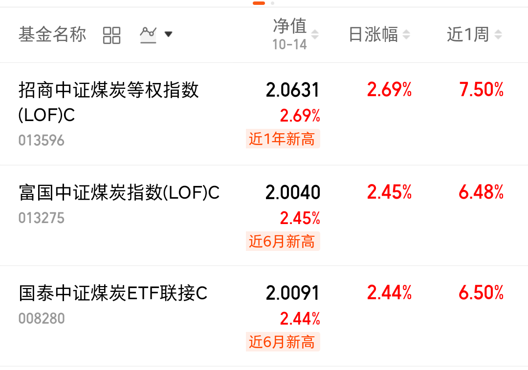 $招商中证煤炭等权指数(LOF)C(OTCFUND|013596)$昨天上涨2.69%,涨幅领先,长期业绩也比较优秀,近半年上涨17.84%。