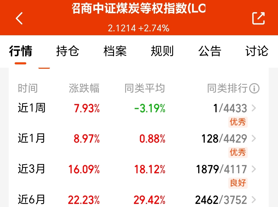 今日A股整体调整,主要指数低开低走,科技板块全面回调,而煤炭赛道逆势走强。当前 “反内卷”政策推动行业优化,产能置换限制规模,双重因素引发煤炭供应收缩,持续支撑煤价稳步上涨。随着四季度到来,煤炭板块利好信号明确。$招商中证煤炭等权指数(LOF)C(OTCFUND|013596)$紧密跟踪中证煤炭等权指数,重仓中煤能源等龙头企业,覆盖多区域煤企。昨天上涨2.74%,今天盘中逆势上涨1.07%,我打算着手布局起来,抓一波四季度行情。#稀土价格暴涨37%!稀土板块狂飙#