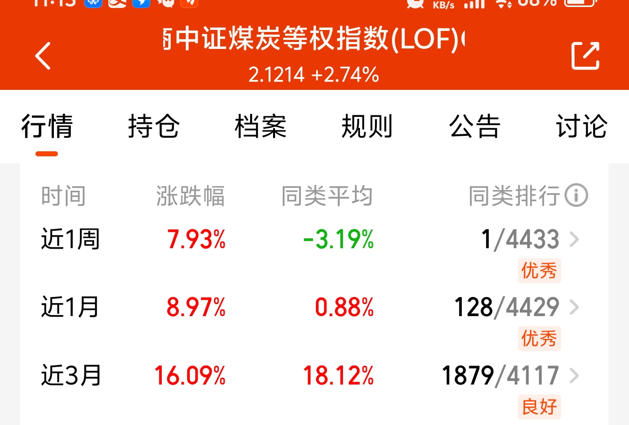 最近市场回调,科技下杀!市场赚钱效应非常差,科技调整,资金回流到低位板块,值得注意的是,最近周期资源,煤炭板块,走势还是非常不错的!$招商中证煤炭等权指数(LOF)C$ 昨日招商中证煤炭大涨2.74%,近一周涨幅7.93%,表现非常优秀!市场调整,高息股会有意想不到的惊喜!