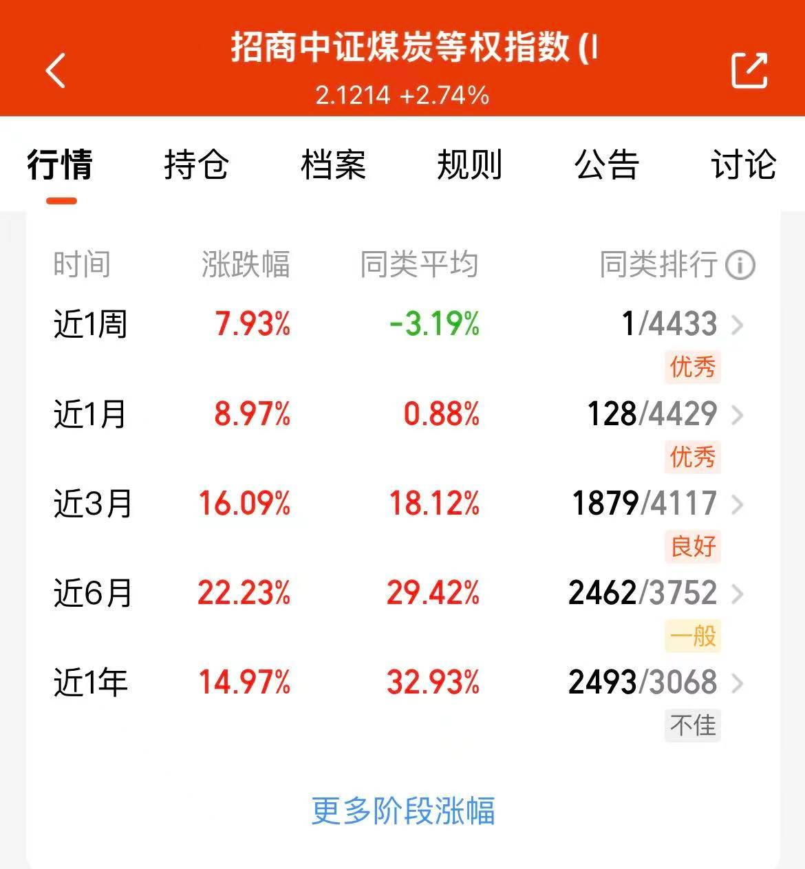 今天A股和港股都低开低走,下跌的个股比较多,科技、军工、医药等等都是回调了,不过煤炭方向还逆势上涨了,$招商中证煤炭等权指数(LOF)C(OTCFUND|013596)$是紧密跟踪中证煤炭等权指数的,重仓有中煤能源、宝泰隆等企业,眼下反内卷政策持续促行业自律,还有产能置换限产规模等等,这都是对于煤炭来说是不错的利好,长期来看还是上涨趋势的!