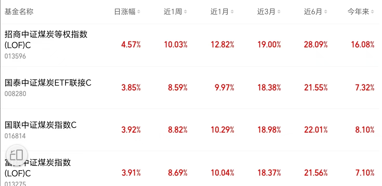 $招商中证煤炭等权指数(LOF)C(OTCFUND|013596)$昨天上涨4.57%,领涨同类;