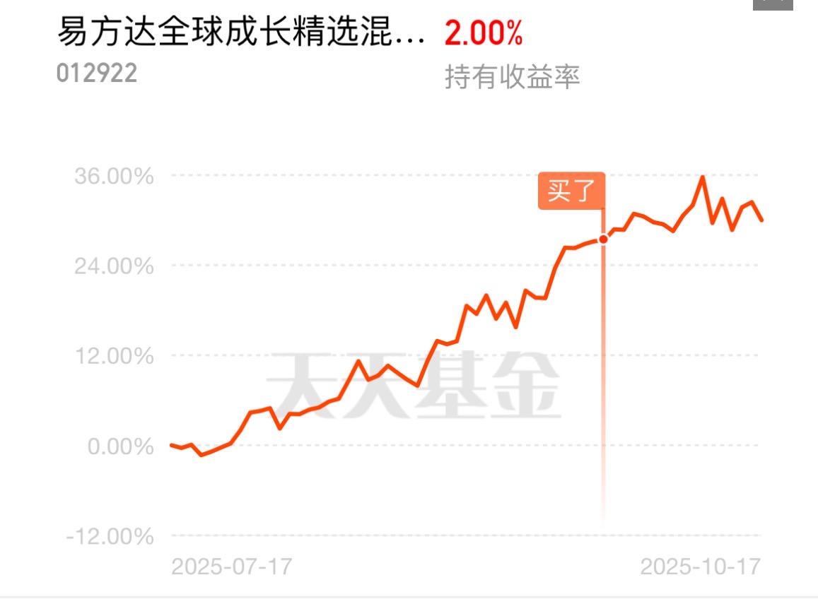 今天a股港股行情比较让人开心,昨天美股也是大涨,今天黄金又反包回来了昨天的跌幅,降息周期开启,全球科技类资产有望受益,想要都跟上那是有点难,既然单独看一个市场容易踏空或者风险过高,确实我觉得手上全球配置绩优低回撤的$易方达全球成长精选混合(QDII)人民币C$ 还是很好选项,近一年76.72%大幅跑赢大牛指数纳斯达克,额度还有,我找机会还会继续跟。