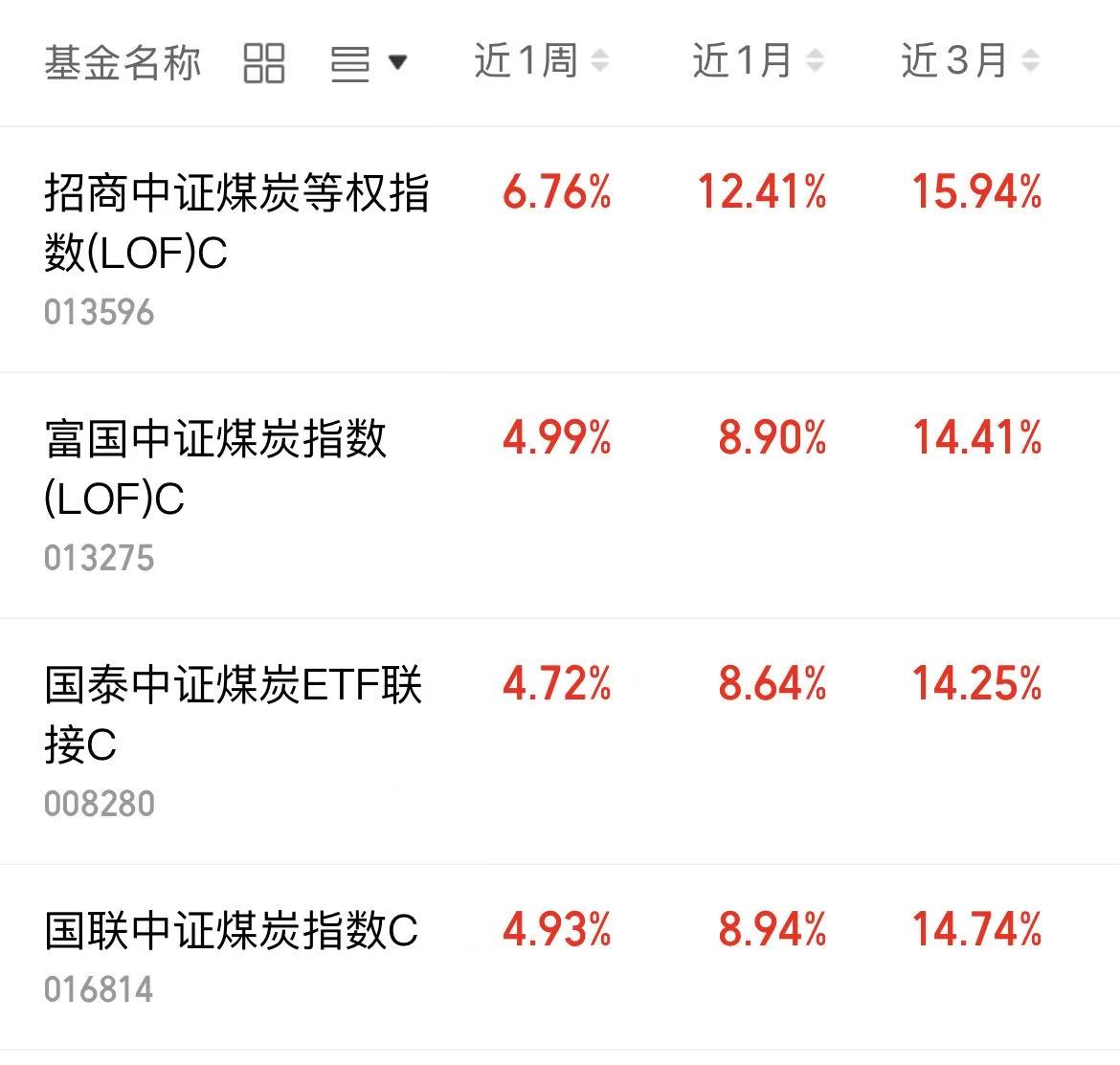 $招商中证煤炭等权指数(LOF)C(OTCFUND|013596)$近一周涨幅6.76%,近一个月涨幅12.41%