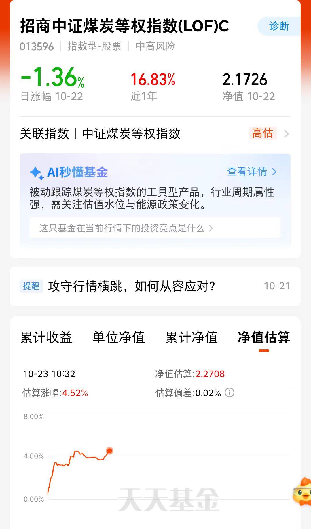 今天股市行情调整,煤炭板块却逆势上涨呢,不仅冷冬冬储需求增强,我们国家储能概念也在增强,煤炭板块,现在上车还不晚,$招商中证煤炭等权指数(LOF)C(OTCFUND|013596)$,昨天仅仅调整1.36%,今天盘中估值就反弹4.52%,修复能力强,大家也可以关注一下,有机会就上车。