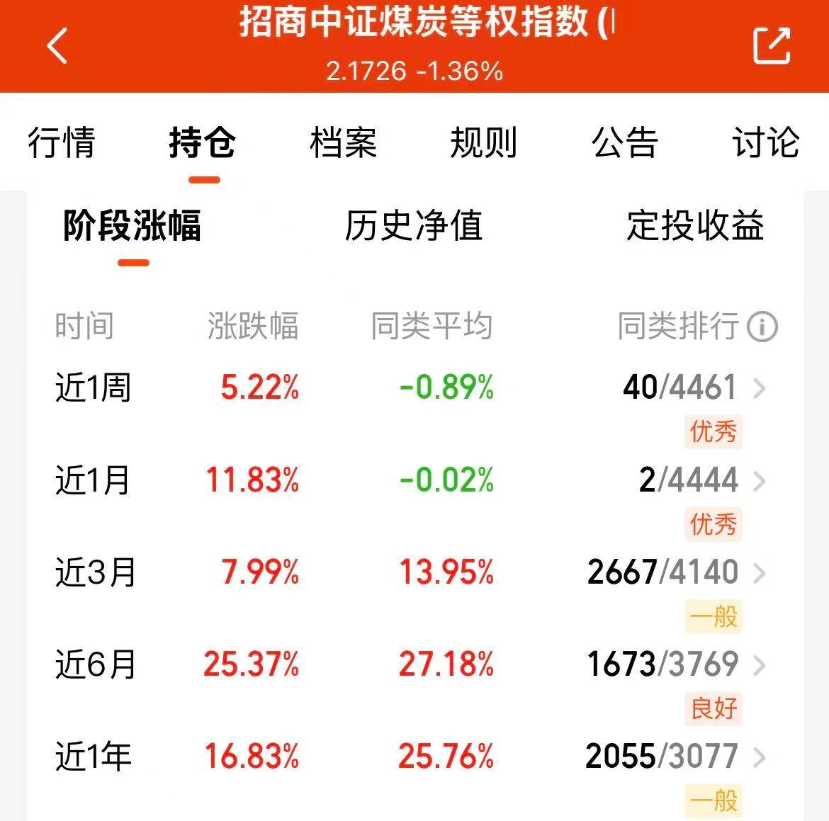 今天大盘延续震荡,上涨的个股比较少,还是板块分化了,科技、军工、医药等等基本都是吃大面,不过煤炭方向今天还逆势上涨啦,$招商中证煤炭等权指数(LOF)C(OTCFUND|013596)$估值上涨4.29%,近一个月涨幅11.83%,近六个月涨幅25.37%,是紧密跟踪中证煤炭等权指数的,重仓有中煤能源、宝泰隆等企业,反内卷政策持续促行业自律,煤炭方向持续看好!