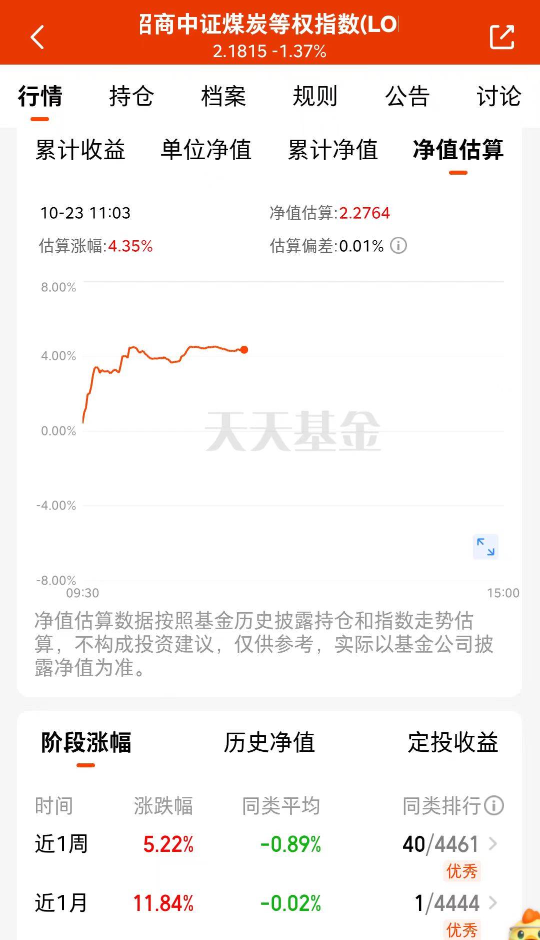 最近股市还是有点震荡,但是煤炭板块行情持续上涨呢,涨幅也比较可观,$招商中证煤炭等权指数(LOF)C(OTCFUND|013596)$近一周上涨5.22%,近一个月上涨11.83%,远远高于同类平均涨幅,看业绩涨幅就是个能涨抗跌的选手,国内煤炭市场也呈现了“产地补涨”的特征,冬储需求推动市场情绪升温,我看好后期涨幅预期,敬请期待。