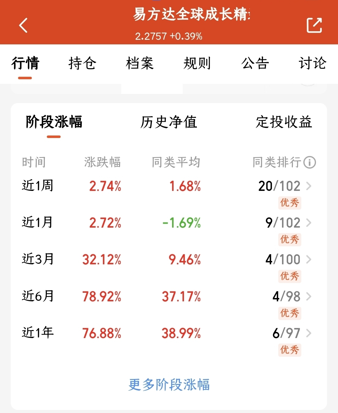 最近大A震荡,全球科技倒是不错。$易方达全球成长精选混合(QDII)人民币C$ 投资全球科技稀缺产品,灵活布局A、H、美股,规避风险把握机遇。基金经理精准预判,调仓灵活,业绩稳健。科技行情长期向好,回调恰是上车良机。